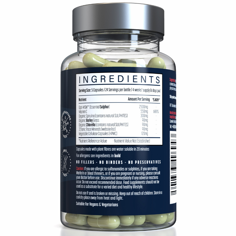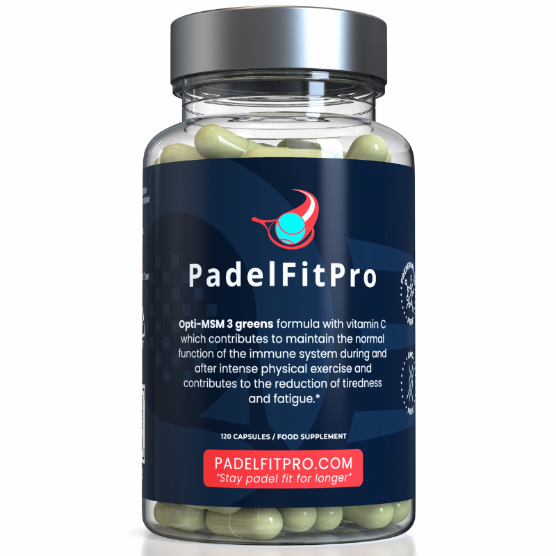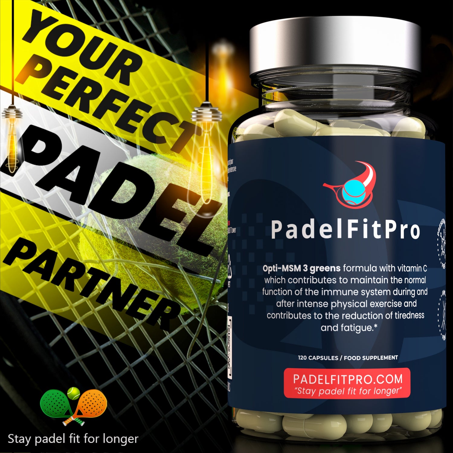 PadelFitPro is a unique supplement containing a combination of different ingredients working in synergy to best effect: bio-available Opti-MSM, also known as essential sulphur, vitamin C, organic spirulina, organic barley grass, organic chlorella and ionic trace minerals.